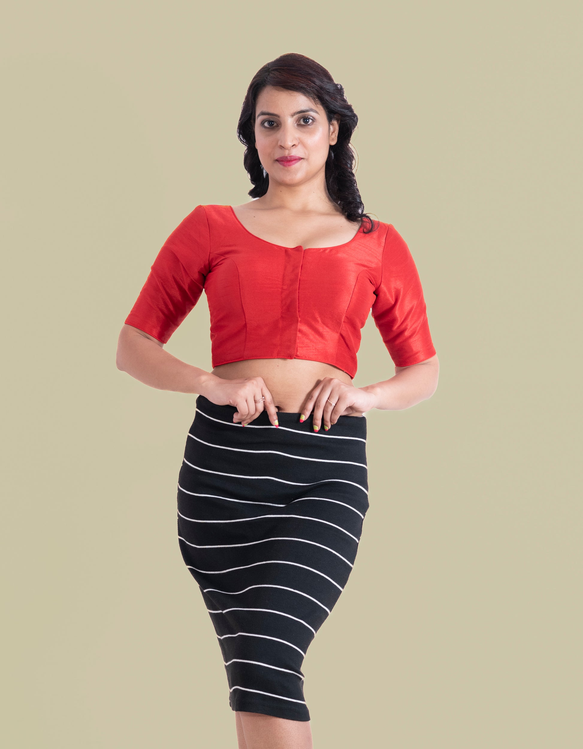 This classic elbow sleeves red blouse is handmade from raw silk fabric. Its pleasant crepe lining, soft cups pad and delicate tassels add a subtle quality that will make it a timeless addition to your wardrobe.